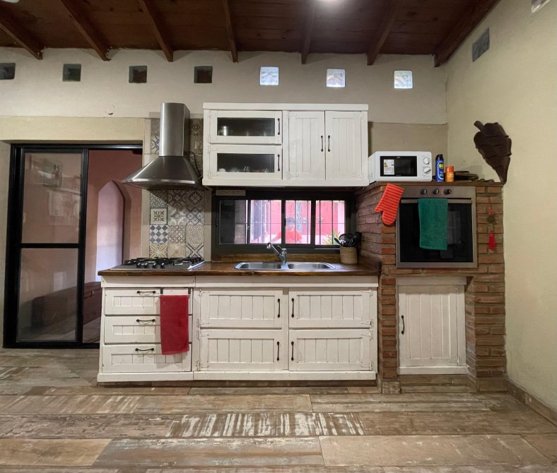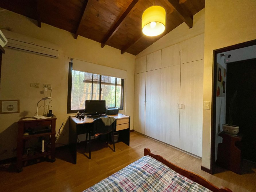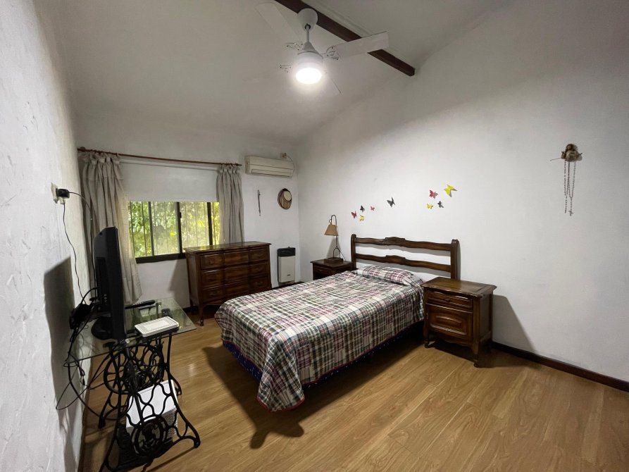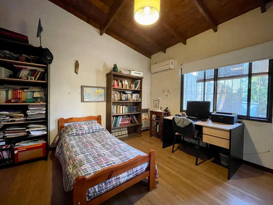 Planta baja: Hall de recepción, amplio living - comedor, cocina, un dormitorio, baño con antebaño, quincho al fondo con ventanas balcón al jardín, pequeño galpón y jardín libre con galería semicubierta.