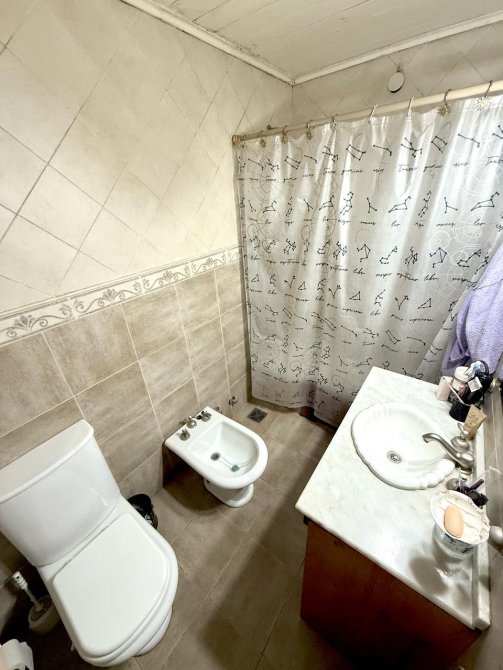 Cuenta con tres habitaciones, una de ellas con placard, otra con armario y una tercera ideal para huéspedes o como espacio de trabajo. Dos baños, uno en suite y otro de uso general con ducha, un luminoso living con hogar a leña, biblioteca, comedor diario y cocina equipada.